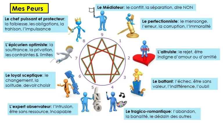 Chaque type de personnalité dans l’Ennéagramme correspond à une manière particulière de penser, ressentir et agir en fonction des motivations fondamentales et des peurs profondes. L’objectif n’est pas de nous enfermer dans un type, mais plutôt de nous aider à identifier nos comportements automatiques afin de nous en libérer et de progresser vers un équilibre émotionnel et spirituel.
